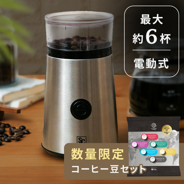 【コーヒーミル】■定格電源AC100V 50/60Hz■定格消費電力150W■最大投入量60g■連続運転時間45秒(連続運転後は2分休止)■カッター回転数26000rpm■商品サイズ(cm)幅約10.5×奥行約10.5×高さ約18.2(電源コード除く)■商品質量約0.8kg■電源コード長さ約1.0m■付属品お手入れブラシ■カラーブラック【コーヒー豆】■内容量50g×6種■原材料コーヒー豆■原産国ブ
