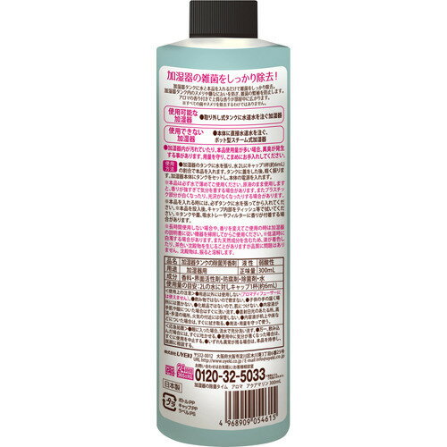 【使用方法】・加湿器のタンクに水を張り、水2Lにキャップ1杯(約6ml)の割合で本品を入れます。