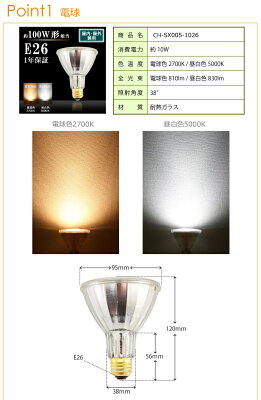 [製品仕様(電球)] 商品名:LED電球ビームランプ形/LEDスポットライト 口金:E26 サイズ:Φ123mm×133mm 材質:耐熱ガラス 演色性:Ra80以上 照射角度:38° 色温度:電球色 2700K/昼白色 5000K 全光束:電球色 810lm/昼白色 850lm 定格電圧(周波数):AC85-240V (50/60Hz) 消費電力:10W 重量:405g 調光器:非対応 保証期間:1年保証 ※到着から7日以上経過した商品の故障については、保証期間内であっても送料はご負担願います。